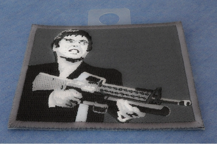 Say Hello to my Little Friend Iron on Patch measures 3x3 inches and is Embroidered in Black / Gray / White. The patch can be sewn on to Leather Biker Jackets, Vests or Chaps. The patch can also be ironed on to Shirts, Hats or Denim material such as Jeans. Features plastic iron on backing and clean laser cut embroidered borders. Japanese made iron on glue requires temperature between 270-290 Degrees Fahrenheit. Use a heat press for 30 seconds to adhere the patch permanently to your clothing. Using a regular household iron will probably not be as permanent as one hopes. If possible we recommend you sew on your patches for a more durable application. Never iron on patches to Leather or Nylon materials.