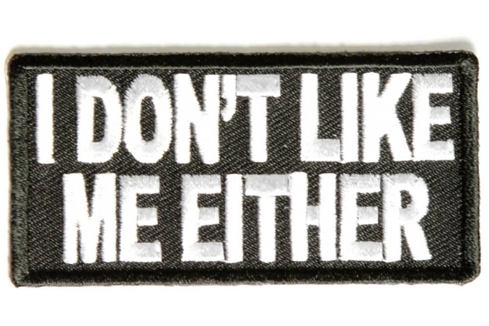 I don't like me either patch for assholes with humor. Embroidered in white over black and measures 3x1.5 inches.
