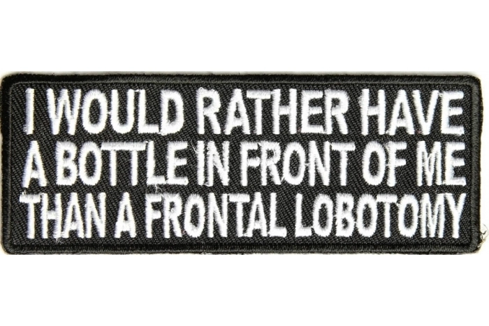 I would rather have a bottle in front me than a frontal lobotomy. The 4x1.5 inch iron on patch is Embroidered in white over black twill.