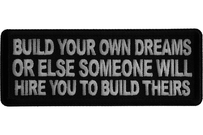 Build Your Own Dreams or Else Someone Will Hire you to Build Theirs Iron on Patch measures 4x1.5 inches and is Embroidered in Black / White. The patch can be sewn on to Leather Biker Jackets, Vests or Chaps. The patch can also be ironed on to Shirts, Hats or Denim material such as Jeans. Features plastic iron on backing and clean laser cut embroidered borders. Japanese made iron on glue requires temperature between 270-290 Degrees Fahrenheit. Use a heat press for 30 seconds to adhere the patch permanently to your clothing. Using a regular household iron will probably not be as permanent as one hopes. If possible we recommend you sew on your patches for a more durable application. Never iron on patches to Leather or Nylon materials.