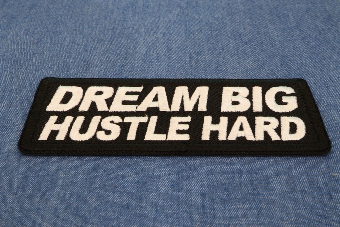 Dream Big Hustle Hard Patch measures 4x1.5 inches and is Embroidered in Black / White. The patch can be sewn on to Leather Biker Jackets, Vests or Chaps. The patch can also be ironed on to Shirts, Hats or Denim material such as Jeans. Features plastic iron on backing and clean laser cut embroidered borders. Japanese made iron on glue requires temperature between 270-290 Degrees Fahrenheit. Use a heat press for 30 seconds to adhere the patch permanently to your clothing. Using a regular household iron will probably not be as permanent as one hopes. If possible we recommend you sew on your patches for a more durable application. Never iron on patches to Leather or Nylon materials.
