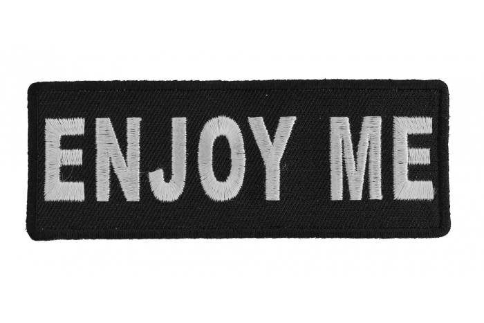 Enjoy Me Patch measures 4x1.5 inches and is Embroidered in Black / White. The Small Patch can be sewn on or ironed on to clothing such as Denim or Leather Jackets, Vests, Hats, Back Packs, Shirts. Features plastic backing and embroidered die cut borders.