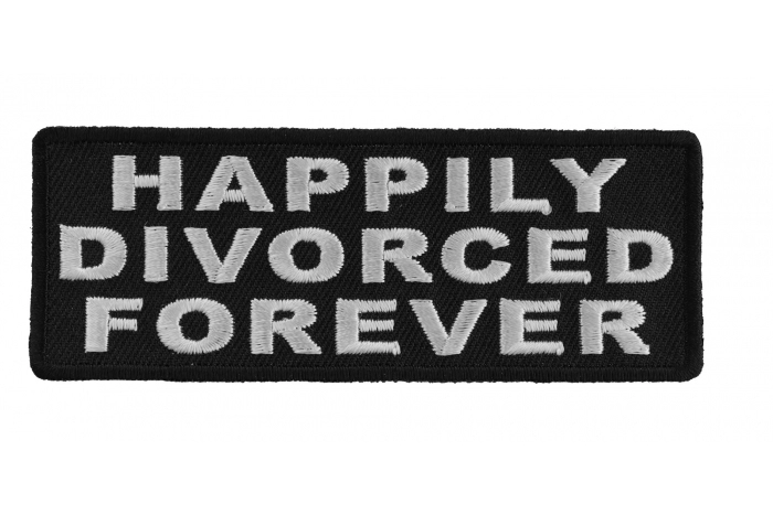 Happily Divorced Forever Patch measures 4x1.5 inches and is Embroidered in Black / White. The Small Patch can be sewn on or ironed on to clothing such as Denim or Leather Jackets, Vests, Hats, Back Packs, Shirts. Features plastic backing and embroidered die cut borders.