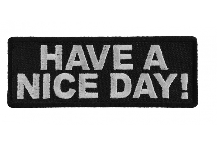Have a Nice Day Patch measures 4x1.5 inches and is Embroidered in Black / White. The Small Patch can be sewn on or ironed on to clothing such as Denim or Leather Jackets, Vests, Hats, Back Packs, Shirts. Features plastic backing and embroidered die cut borders.
