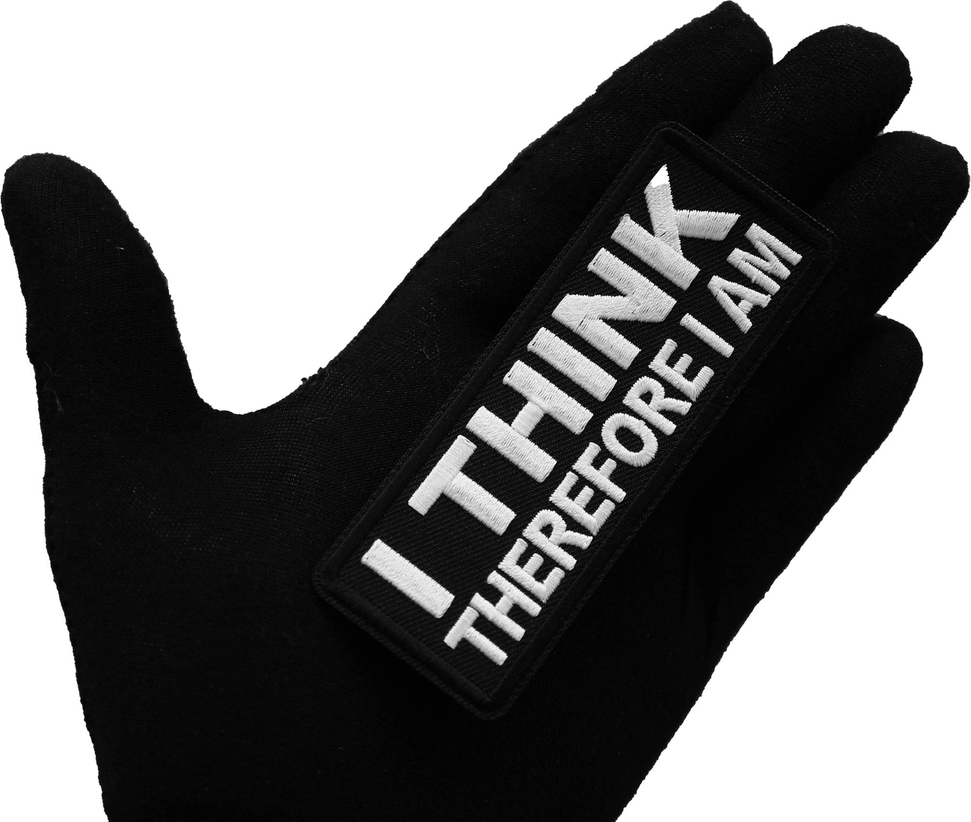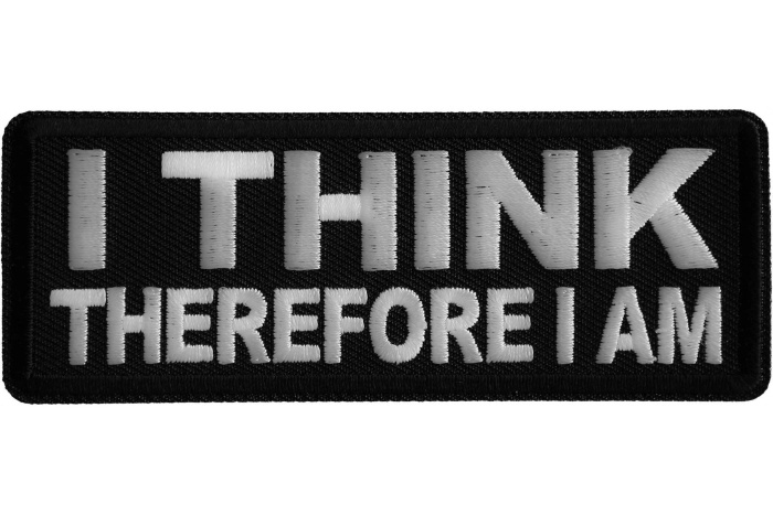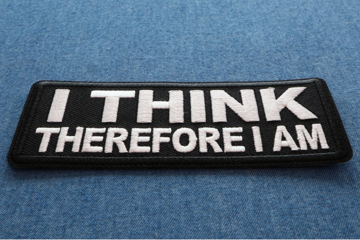 I think therefore I am Iron on Patch measures 4x1.5 inches and is Embroidered in Black / White. The patch can be sewn on to Leather Biker Jackets, Vests or Chaps. The patch can also be ironed on to Shirts, Hats or Denim material such as Jeans. Features plastic iron on backing and clean laser cut embroidered borders. Japanese made iron on glue requires temperature between 270-290 Degrees Fahrenheit. Use a heat press for 30 seconds to adhere the patch permanently to your clothing. Using a regular household iron will probably not be as permanent as one hopes. If possible we recommend you sew on your patches for a more durable application. Never iron on patches to Leather or Nylon materials.
