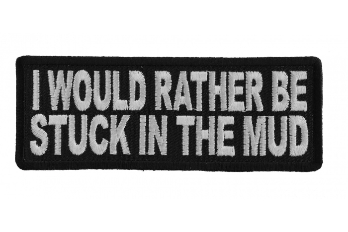 I would Rather be Stuck in the Mud Patch measures 4x1.5 inches and is Embroidered in Black / White. The Small Patch can be sewn on or ironed on to clothing such as Denim or Leather Jackets, Vests, Hats, Back Packs, Shirts. Features plastic backing and embroidered die cut borders.