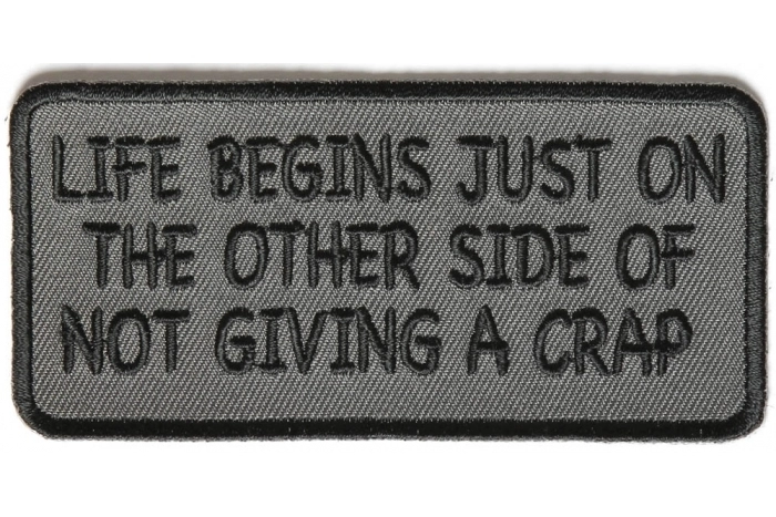 Life Begins just on the other side of not giving a crap Patch is embroidered in black on gray. Measures 4x2 inches. The patch can be sewn or ironed on. Do not iron on patches to leather or nylon material.