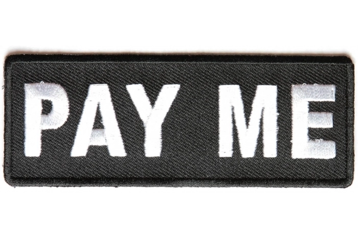 Pay Me Patch measures 4x1.5 inches and is Embroidered in Black / White. The Small Patch can be sewn on or ironed on to clothing such as Denim or Leather Jackets, Vests, Hats, Back Packs, Shirts. Features plastic backing and embroidered die cut borders.
