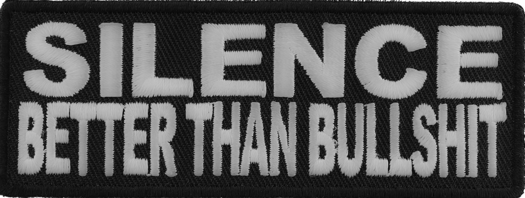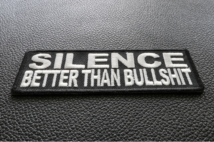 Silence Better Than Bullshit Patch measures 4x1.5 inches and is embroidered in Black / White. You can sew this patch on your leather or nylon jacket. It features die cut borders for easy sewing. We also have treated the plastic backing of this patch with heat activated glue. You can also iron on this patch to your clothing. The plastic iron on backing not only gives you the capability to iron on the patch, but it also helps keep the stitches together over time. This is another quality embroidered iron on patch from The Cheap Place. Please refrain from ironing on patches to leather or nylon. Since we cater mainly to Bikers who get them sewn on leather we make sure all our patches feature single color borders for easy sew on application.