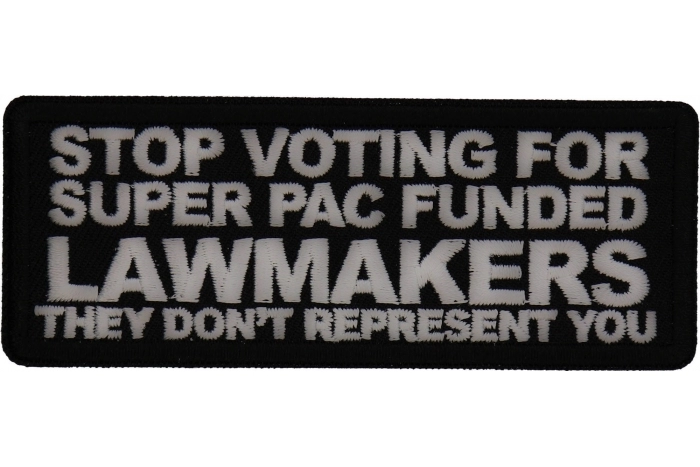 Stop Voting For Super Pac Funded Lawmakers They Don't Represent You Patch measures 4x1.5 inches and is Embroidered in Black / White. The patch can be sewn on to Leather Biker Jackets, Vests or Chaps. The patch can also be ironed on to Shirts, Hats or Denim material such as Jeans. Features plastic iron on backing and clean laser cut embroidered borders. Japanese made iron on glue requires temperature between 270-290 Degrees Fahrenheit. Use a heat press for 30 seconds to adhere the patch permanently to your clothing. Using a regular household iron will probably not be as permanent as one hopes. If possible we recommend you sew on your patches for a more durable application. Never iron on patches to Leather or Nylon materials.