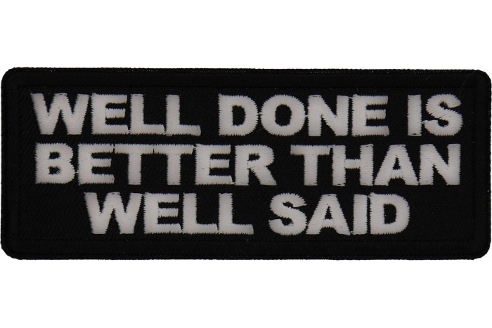 Well Done is Better Than Well Said Patch measures 4x1.5 inches and is Embroidered in Black / White. The patch can be sewn on to Leather Biker Jackets, Vests or Chaps. The patch can also be ironed on to Shirts, Hats or Denim material such as Jeans. Features plastic iron on backing and clean laser cut embroidered borders. Japanese made iron on glue requires temperature between 270-290 Degrees Fahrenheit. Use a heat press for 30 seconds to adhere the patch permanently to your clothing. Using a regular household iron will probably not be as permanent as one hopes. If possible we recommend you sew on your patches for a more durable application. Never iron on patches to Leather or Nylon materials.