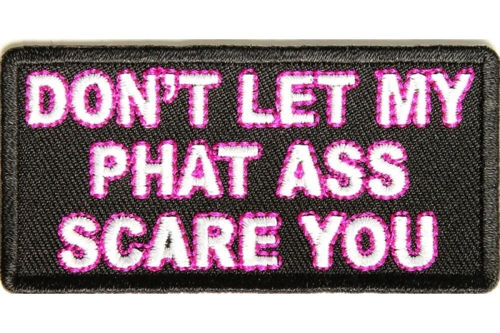 For those with oversize butts who are really nice people say it with the patch that reads "Don't let my phat ass scare you". Patch measures 3x1.5 inches. Embroidered in white with pink outline.