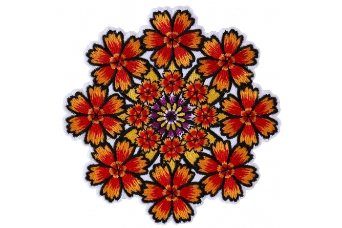 Kaleidoscope Flowers Patch measures 4x4 inches and is Embroidered in Yellow / Orange / Pink / White / Black. It took some 6 months to design this patch. The story of it is one to hear. We didn't get a photo of a flower off the internet to create it, we actually grew our own flower and picked the perfect peddle, placed it under glass to flatten it out and snapped a photo of it. The next step was messing around with it on photoshop to come up with this geometrically symmetric and beautiful flower pattern. The embroidery on it really makes it stand out. Check out the video of the patch to see how detailed the stitching are on this flower patch.