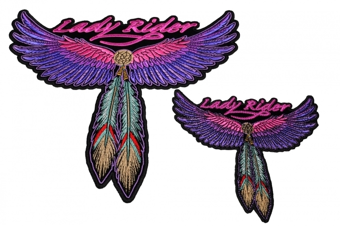 - Lady Rider 2 Piece Front and Back Patch Set With Pink and Purple Wings and Feathers
