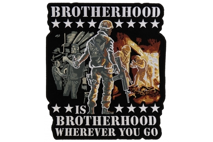 Brotherhood Biker Veteran Large Patch. The embroidered iron on patch measures 10x11.25 inches. A great large back patch for Veterans and Bikers with the message Brotherhood is Brotherhood Wherever you go. The large back patch has die cut borders so it can be sewn on the back of leather jackets or vests. The patch also has plastic iron on backing. It can also be ironed on to non-leather products such as jeans, cotton shirts, non-synthetic material jackets.