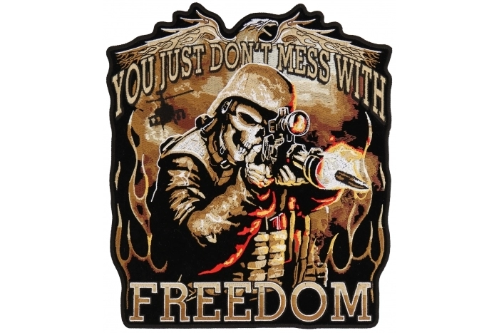 You just don't mess with Freedom. This patch sends the message out nice with a skeleton soldier firing his sniper rifle at you. This new embroidered patch is for all Veterans, Bikers and those who would risk their own lives in the name of Freedom.