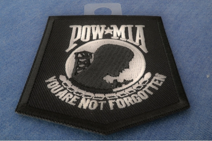 This is the POW MIA (Prisoner of War, Missing in Action) Patch featuring white embroidery on a black background. The patch features a symbol of soldier facing side ways with his head slightly tilted over a prisoner of war camp tower. The patch measures a perfect 2.5 x 3 inches and is ideal for your biker vest or jacket, as well as other biker accessories. You can iron on the patch to denim materials or sew them on to leather. There is plastic backing on the backside of the patch. These patches do not have hook backing, if you are interested in hook backings we do sell peel and stick hook backing that works very well on patches with plastic backing. You can also find various different color combinations of this POW MIA Patch at our online store.