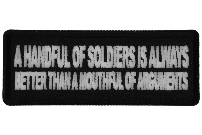 A Handful of Soldiers is Always Better than a Mouthful of Arguments Patch measures 4x1.5 inches and is Embroidered in Black / White. The Small Patch can be sewn on or ironed on to clothing. You should sew patches on to leather jackets or vests. Refrain from ironing on patches to nylon or leather material. The correct iron on temperature is 270 degrees Fahrenheit. If you are using a household iron you should press down for 30 seconds. If you are using a heat press 12 seconds is sufficient. The patch features clean cut embroidered borders