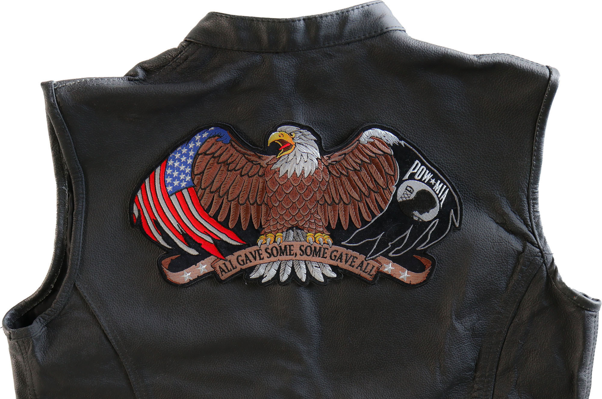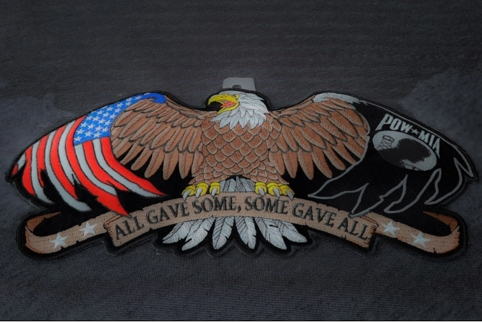 The embroidered patch in the image features a patriotic and commemorative design centered on a bald eagle, symbolizing American strength and freedom, with elements honoring military service. The eagle is depicted with its wings spread wide, showcasing its impressive wingspan, and is stitched in shades of brown for the body, white for the head, and yellow for the beak and talons, with gray and white accents for the feathers, giving it a detailed and realistic appearance. On the left side, behind the eagle's wing, is an American flag with red and white stripes and a blue field with white stars, symbolizing national pride. On the right side, there is a POW-MIA emblem, featuring a black silhouette of a soldier's head in front of a guard tower and barbed wire, with the text "POW-MIA" in white, honoring prisoners of war and those missing in action. Below the eagle, a banner stretches across the bottom, stitched in beige with a distressed edge, bearing the phrase "ALL GAVE SOME, SOME GAVE ALL" in black capital letters, a tribute to the sacrifices of military personnel. The banner is accented with small white stars at each end, adding a patriotic touch. The patch has a black background with a black zigzag stitch border that follows the irregular contours of the eagle's wings and the banner, set against a dark fabric surface, likely denim, which makes the colors stand out. This patch, with its combination of the eagle, American flag, POW-MIA emblem, and tribute message, likely appeals to veterans, patriots, or those honoring military service, intended for decorative use on jackets, vests, or bags to convey respect and remembrance.