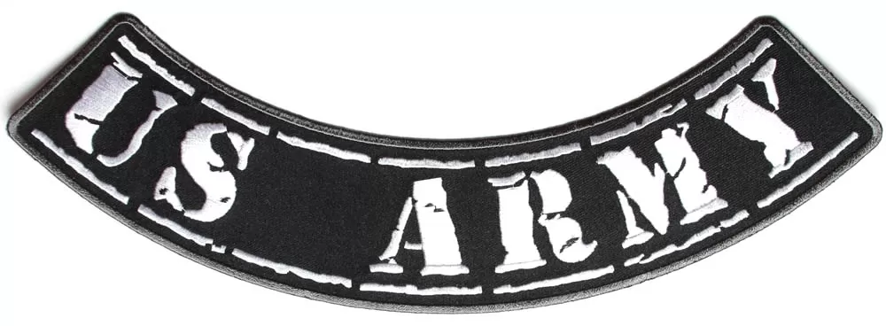 US Army Large Lower Rocker Patch measures 12x2.5 inches and is Embroidered in Black / White. The Large Patch can be sewn on or ironed on to clothing such as Denim or Leather Jackets, Vests, Hats, Back Packs, Shirts. Features plastic backing and embroidered die cut borders.