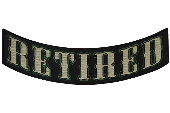 For all those retired get a Retired lower rocker to go on the back of your vest. Measures 4x12 inches. Embroidered in military green theme.