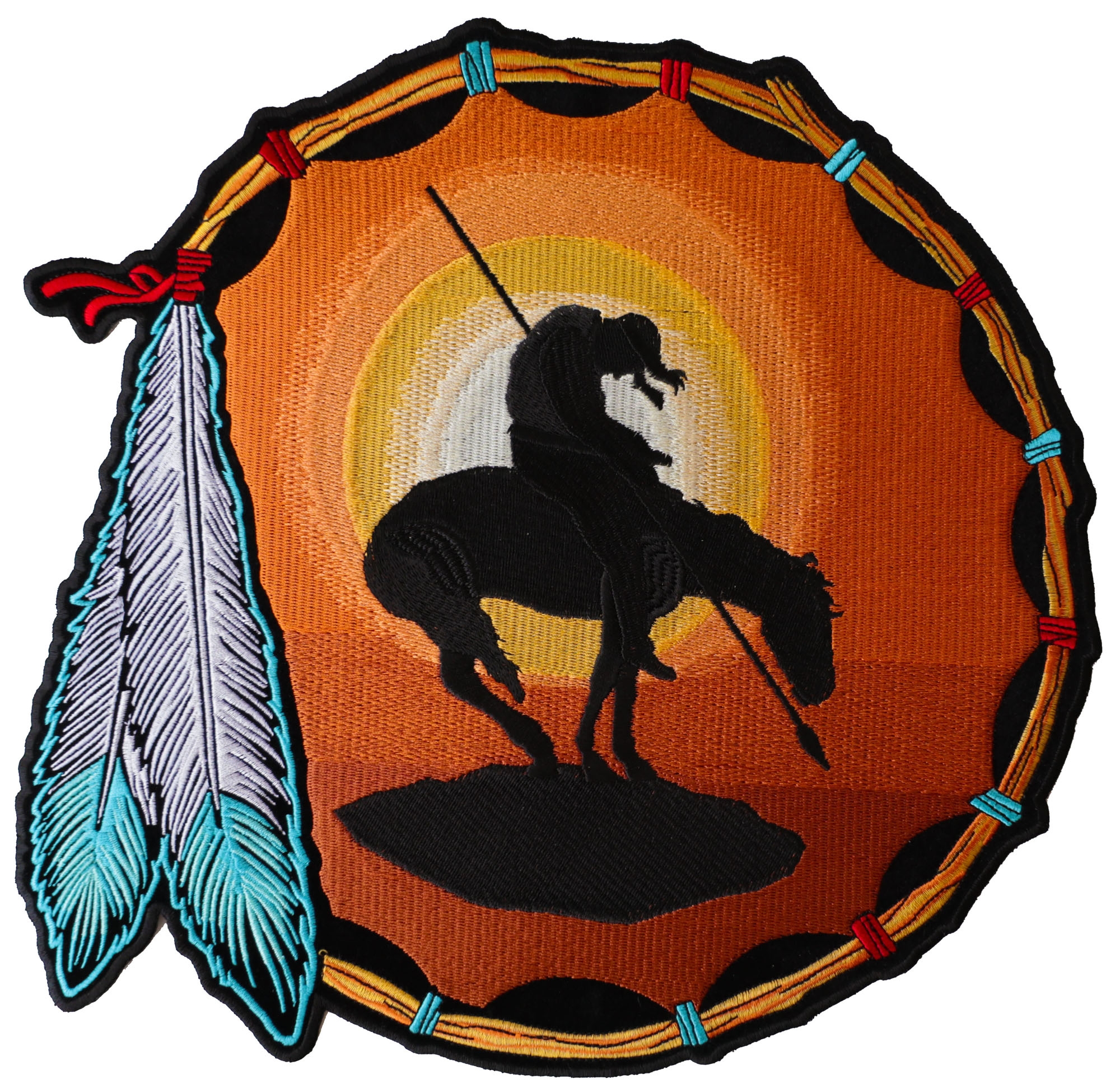 The patch features a circular design with a striking silhouette of a Native American warrior on horseback, set against a gradient background that transitions from a warm orange at the bottom to a lighter yellow at the top, evoking a sunset or sunrise. The warrior, depicted in solid black, is shown in a dynamic pose, rearing up on the horse while holding a spear aloft, with the horse standing on a small hill. Surrounding the central image is a border with a traditional pattern, featuring yellow stitching with small red and blue geometric accents, adding a cultural touch. On the left side of the circle, a large feather element extends outward, with white feathers detailed with blue tips and tied with a red ribbon, further emphasizing the Native American theme. The entire patch is outlined with a thin black border, and it is set against a dark gray background fabric, which makes the warm tones of the central design and the vibrant accents of the feather stand out prominently.