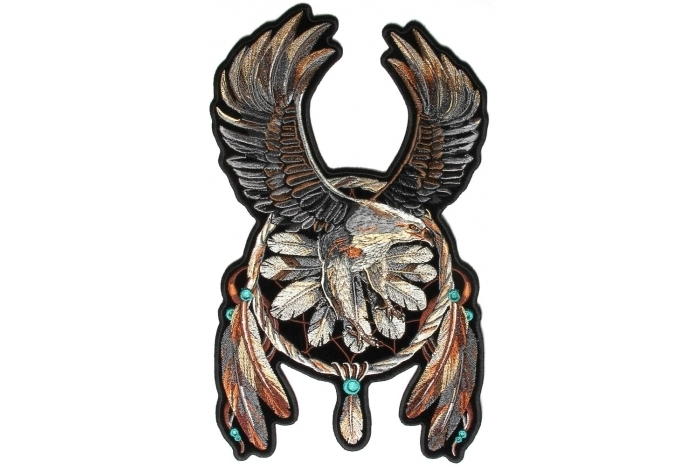 Brown Dreamcatcher Eagle Patch is embroidered in Black / Brown / Gray. Measures 6.5x10 inches. The patch can be sewn or ironed on. Do not iron on patches to leather or nylon material.