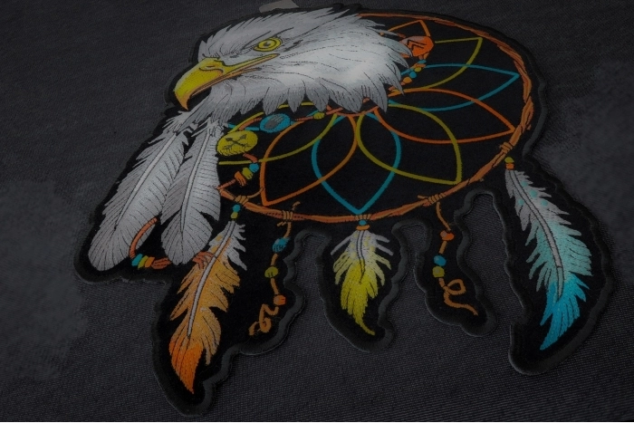 This patch holds incredible meaning. Some may see it in a spiritual perspective or a patriotic perspective. Both can apply. The eagle can symbolize our national emblem caught up in a dream catcher. The idea of the dream catcher derives from Native American culture which is the willow-hooped, net like object behind the eagle. The dream catcher is usually hung over a cradle or bed for protection. Inclusive of the different ways this patch could be interpreted, the patch is equipped with fine, vibrant embroidery with respects to its authentic spiritual/ patriotic ideologies.
