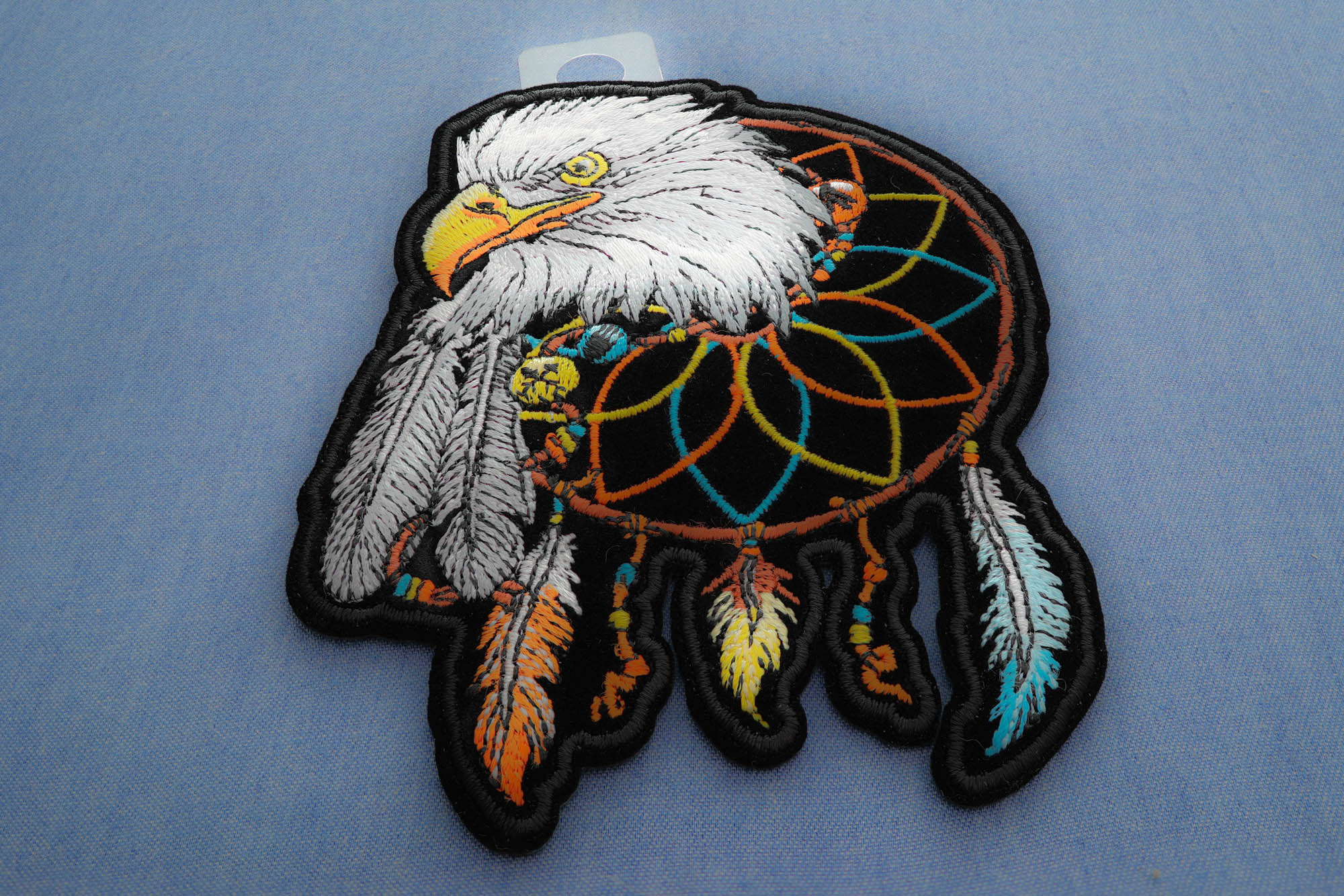 The embroidered patch in the image features a design that combines an eagle's head with a dreamcatcher motif, creating a striking and symbolic piece. The patch has a circular shape at the top, representing the dreamcatcher's hoop, with feather-like elements hanging from the bottom, a common feature in traditional dreamcatcher designs.