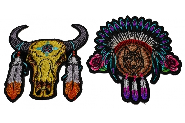 - Set of 2 Native Design Wolf and Buffalo Patches with Feathers