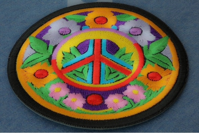 Flowers and Peace Patch Embroidered measures 3x3 inches and is Embroidered in Black / Blue. The patch can be sewn on to Leather Biker Jackets, Vests or Chaps. The patch can also be ironed on to Shirts, Hats or Denim material such as Jeans. Features plastic iron on backing and clean laser cut embroidered borders. Japanese made iron on glue requires temperature between 270-290 Degrees Fahrenheit. Use a heat press for 30 seconds to adhere the patch permanently to your clothing. Using a regular household iron will probably not be as permanent as one hopes. If possible we recommend you sew on your patches for a more durable application. Never iron on patches to Leather or Nylon materials.