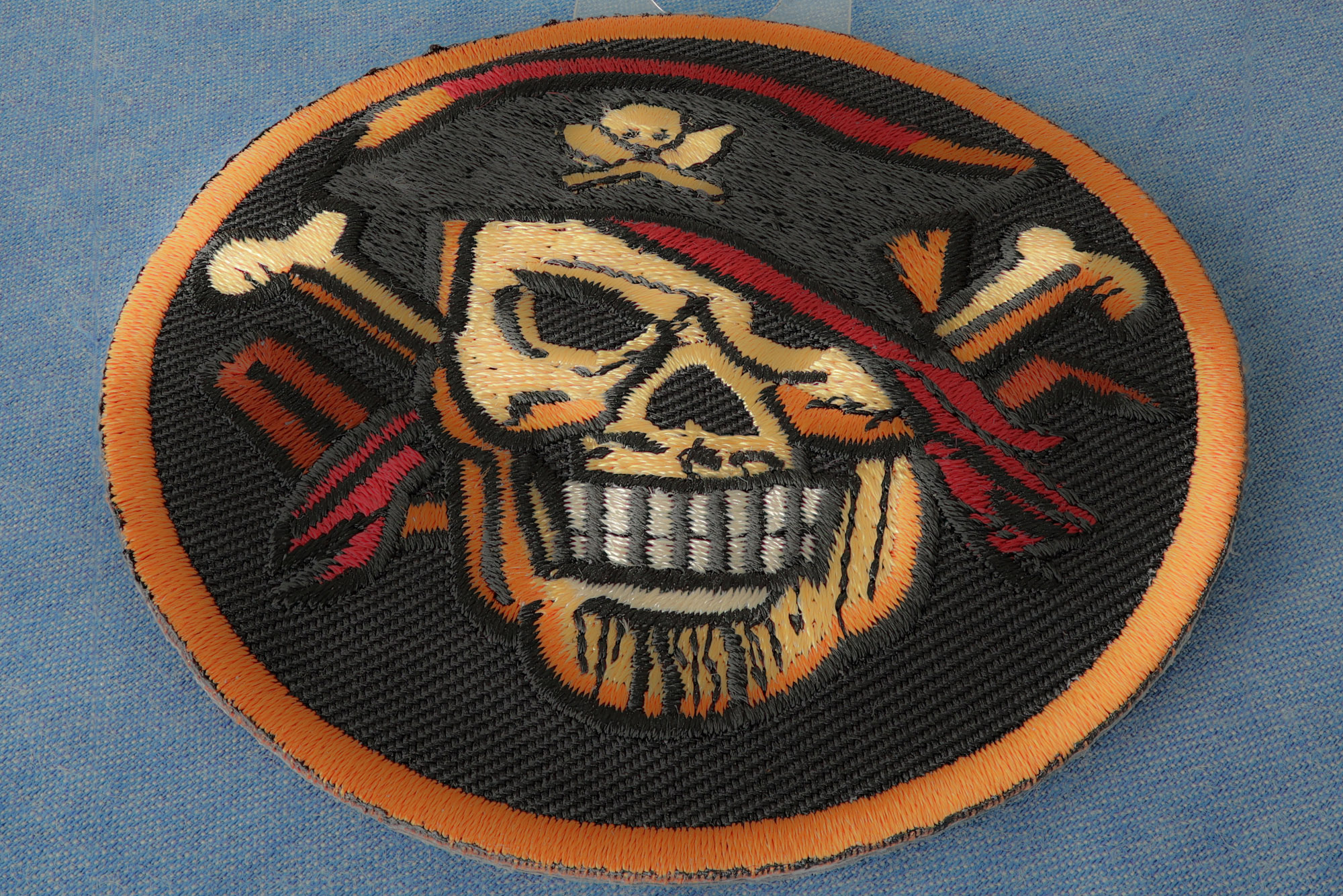 You still get a black background, but the skull is more of a cream color with orange highlights. There is also a little red thrown in for effect. A thick orange border runs around the entire patch.