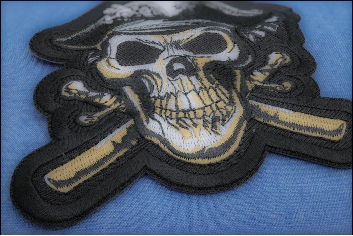 Pirate Skull Patch measures 3.9x4 inches and is Embroidered in Black / Gray / White. The patch can be sewn on to Leather Biker Jackets, Vests or Chaps. The patch can also be ironed on to Shirts, Hats or Denim material such as Jeans. Features plastic iron on backing and clean laser cut embroidered borders. Japanese made iron on glue requires temperature between 270-290 Degrees Fahrenheit. Use a heat press for 30 seconds to adhere the patch permanently to your clothing. Using a regular household iron will probably not be as permanent as one hopes. If possible we recommend you sew on your patches for a more durable application. Never iron on patches to Leather or Nylon materials.