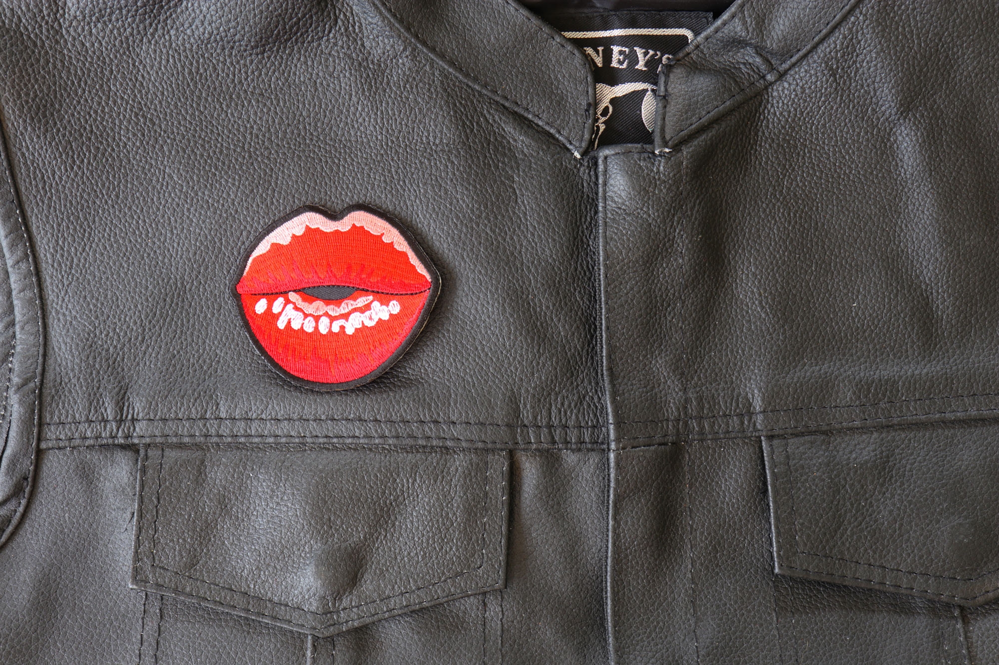This Kissing Lips Small Patch has been perfectly embroidered using 100% red, white, and pink rayon thread. It all combines effortlessly to create a stunning effect. The patch is available in two sizes (3 x 2.7 inch or 4 x 3.6 inch) and is sure to look cool on either leather or denim biker gear. It features Japanese iron-on glue for easy application to non-leather clothing as well as clean-cut embroidered borders that help make it easier to sew on to leathers.