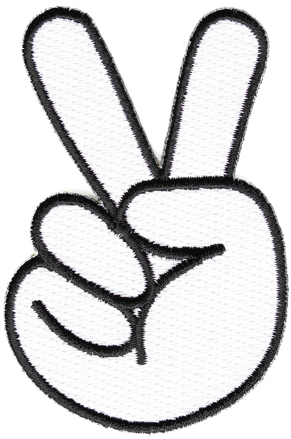 Peace Hand Sign in White Iron on Patch measures 2x3 inches and is Embroidered in Black / White. The Small Patch can be sewn on or ironed on to clothing such as Denim or Leather Jackets, Vests, Hats, Back Packs, Shirts. Features plastic backing and embroidered die cut borders.