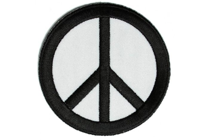 Peace Sign Patch Black on White measures 3x3 inches and is Embroidered in Black / White. The Small Patch can be sewn on or ironed on to clothing such as Denim or Leather Jackets, Vests, Hats, Back Packs, Shirts. Features plastic backing and embroidered die cut borders.