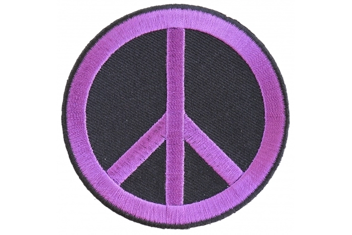 Peace Sign Patch Purple on Black measures 3x3 inches and is Embroidered in Black / Purple. The Small Patch can be sewn on or ironed on to clothing such as Denim or Leather Jackets, Vests, Hats, Back Packs, Shirts. Features plastic backing and embroidered die cut borders.