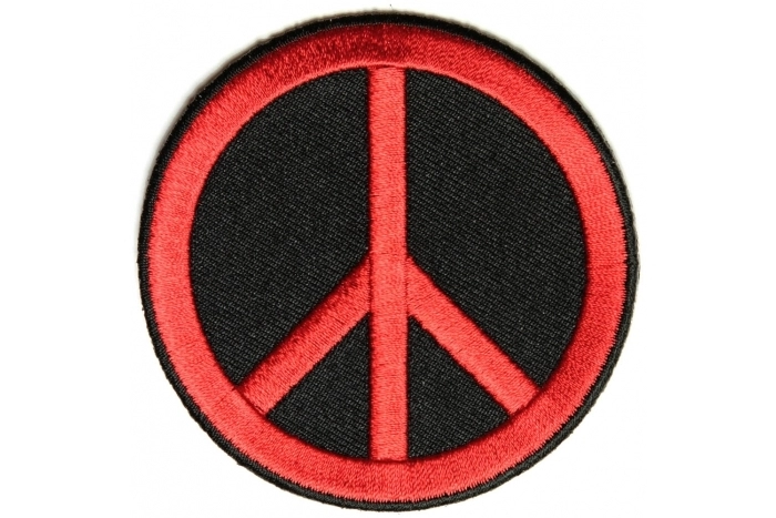 Peace Sign Patch Red on Black measures 3x3 inches and is Embroidered in Black / Red. The Small Patch can be sewn on or ironed on to clothing such as Denim or Leather Jackets, Vests, Hats, Back Packs, Shirts. Features plastic backing and embroidered die cut borders.