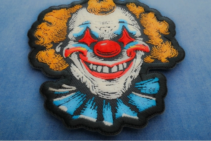 Scary Clown Patch measures 3.5x4 inches and is Embroidered in Black / Orange / Blue / Red. The patch can be sewn on to Leather Biker Jackets, Vests or Chaps. The patch can also be ironed on to Shirts, Hats or Denim material such as Jeans. Features plastic iron on backing and clean laser cut embroidered borders. Japanese made iron on glue requires temperature between 270-290 Degrees Fahrenheit. Use a heat press for 30 seconds to adhere the patch permanently to your clothing. Using a regular household iron will probably not be as permanent as one hopes. If possible we recommend you sew on your patches for a more durable application. Never iron on patches to Leather or Nylon materials.