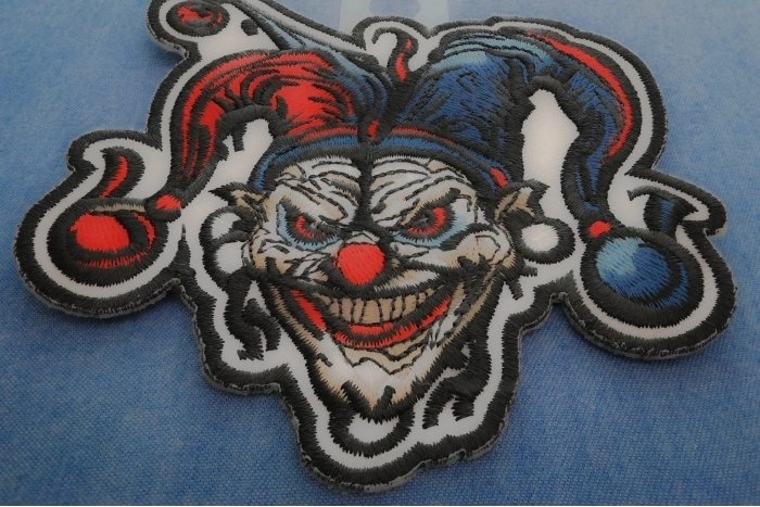 Scary Jester Clown Patch measures 4x4 inches and is Embroidered in Black / Blue / Red. The patch can be sewn on to Leather Biker Jackets, Vests or Chaps. The patch can also be ironed on to Shirts, Hats or Denim material such as Jeans. Features plastic iron on backing and clean laser cut embroidered borders. Japanese made iron on glue requires temperature between 270-290 Degrees Fahrenheit. Use a heat press for 30 seconds to adhere the patch permanently to your clothing. Using a regular household iron will probably not be as permanent as one hopes. If possible we recommend you sew on your patches for a more durable application. Never iron on patches to Leather or Nylon materials.