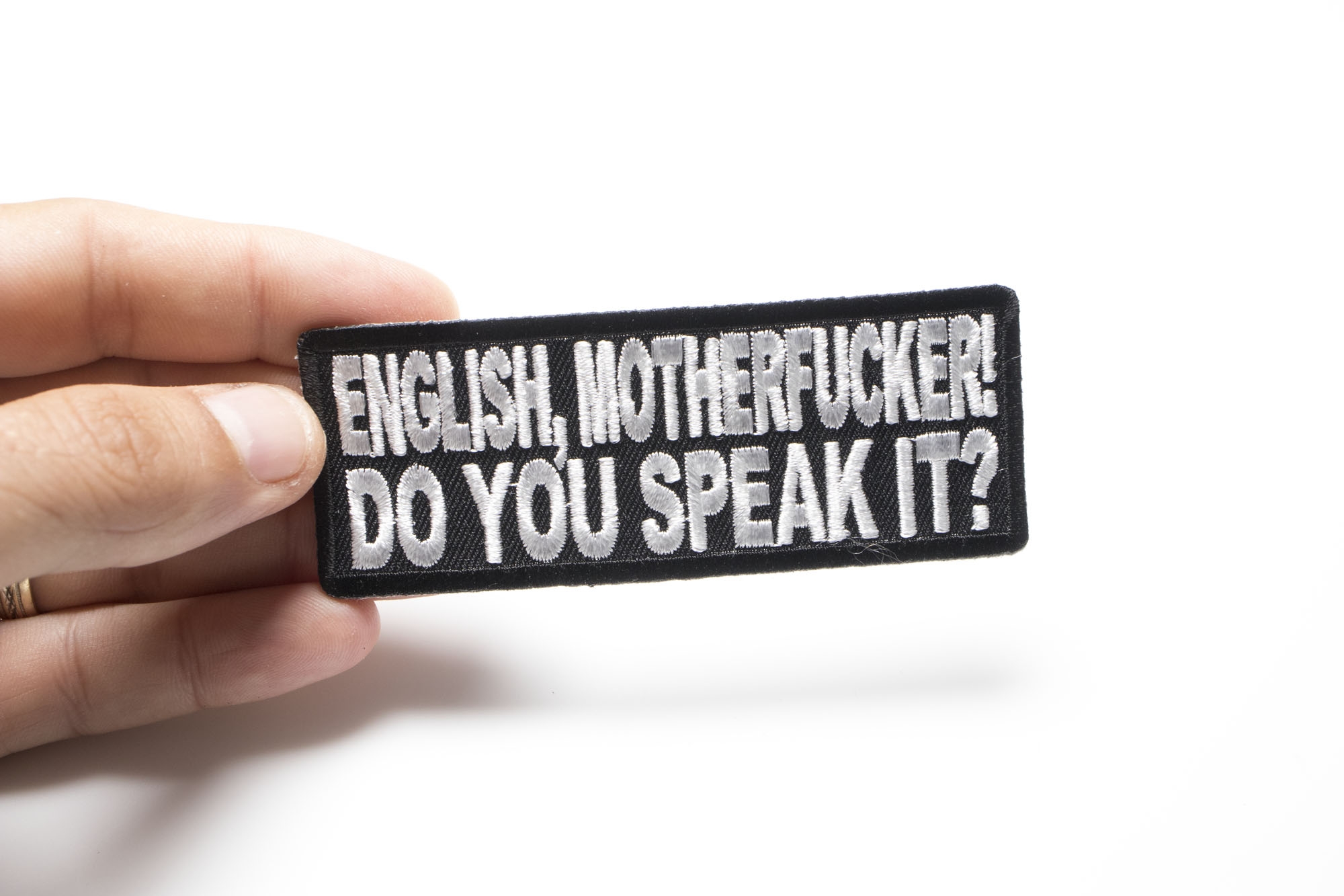 • We laughed very hard when we first read this phrase, English Motherfucker! Do you speak it? The funny patch is embroidered in white over black and measures 4x1.5 inches.