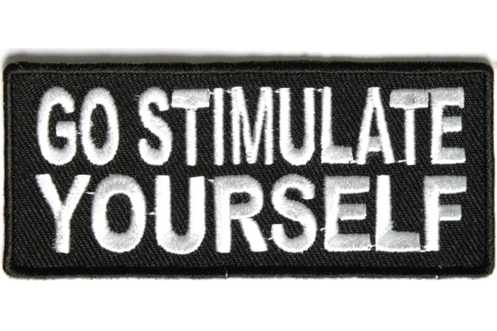 Go Stimulate yourself patch is embroidered. Features plastic iron on backing. Measures 3.5x1.5 inch. Colors used are Black / White The patch can be ironed on or sewed on to your clothing. Please do not iron on patches to leather or nylon material. A heat press is necessary to properly adhere the patch using the iron on method of application. Using a household iron will not produce professional results and the badge will most likely come off after a few washes. Both heat and pressure are a must to properly iron on a patch. We always recommend you sew on these patches to your clothes for a permanent attachment. The die cut borders featured on these emblems makes it very easy for them to be sewn on.