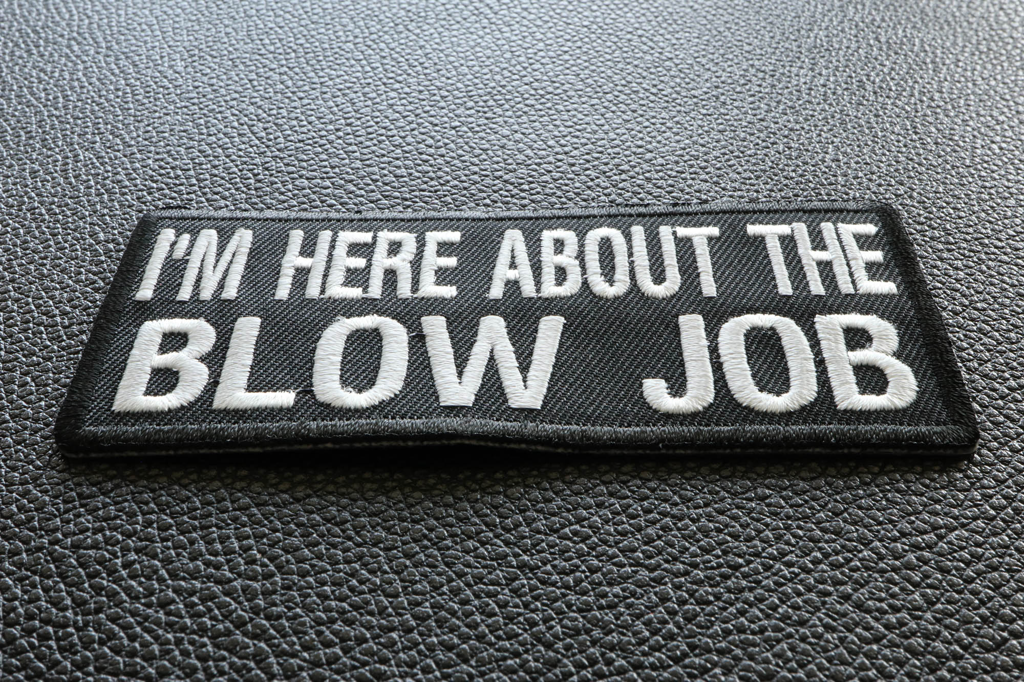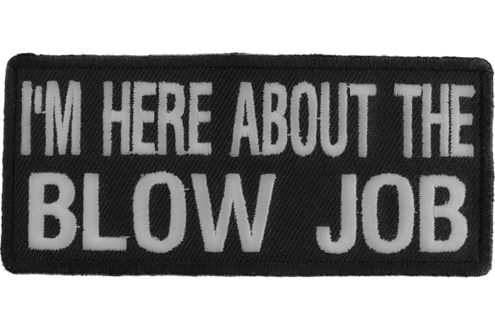- A ridiculously funny patch that says "I'm here about the blow job". Measures 4x1.75 inches and is embroidered in white over black.