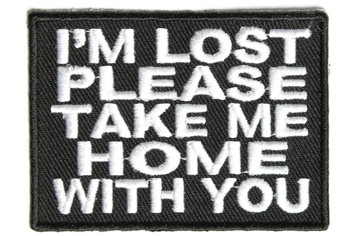 The funny patch says "O'm lost please take me home with you". Embroidered in white over black the patch measures 2.75x2 inches.