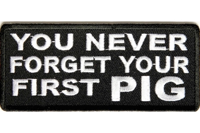 You Never Forget Your First Pig Patch. Embroidered with iron on backing. Measures 4x1.75 inches.