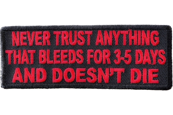 Never Trust Anything That Bleeds 5 Days And Doesn't Die Funny Iron on Patch - 4x1.5 inch