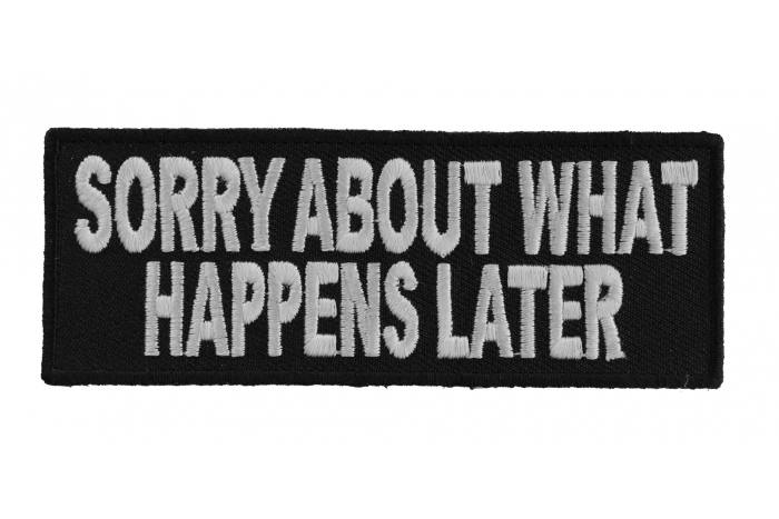 This funny patch says "Sorry about what happens later". Embroidered in white over black the patch measures 4x1.5 inches.