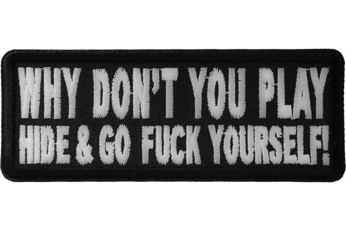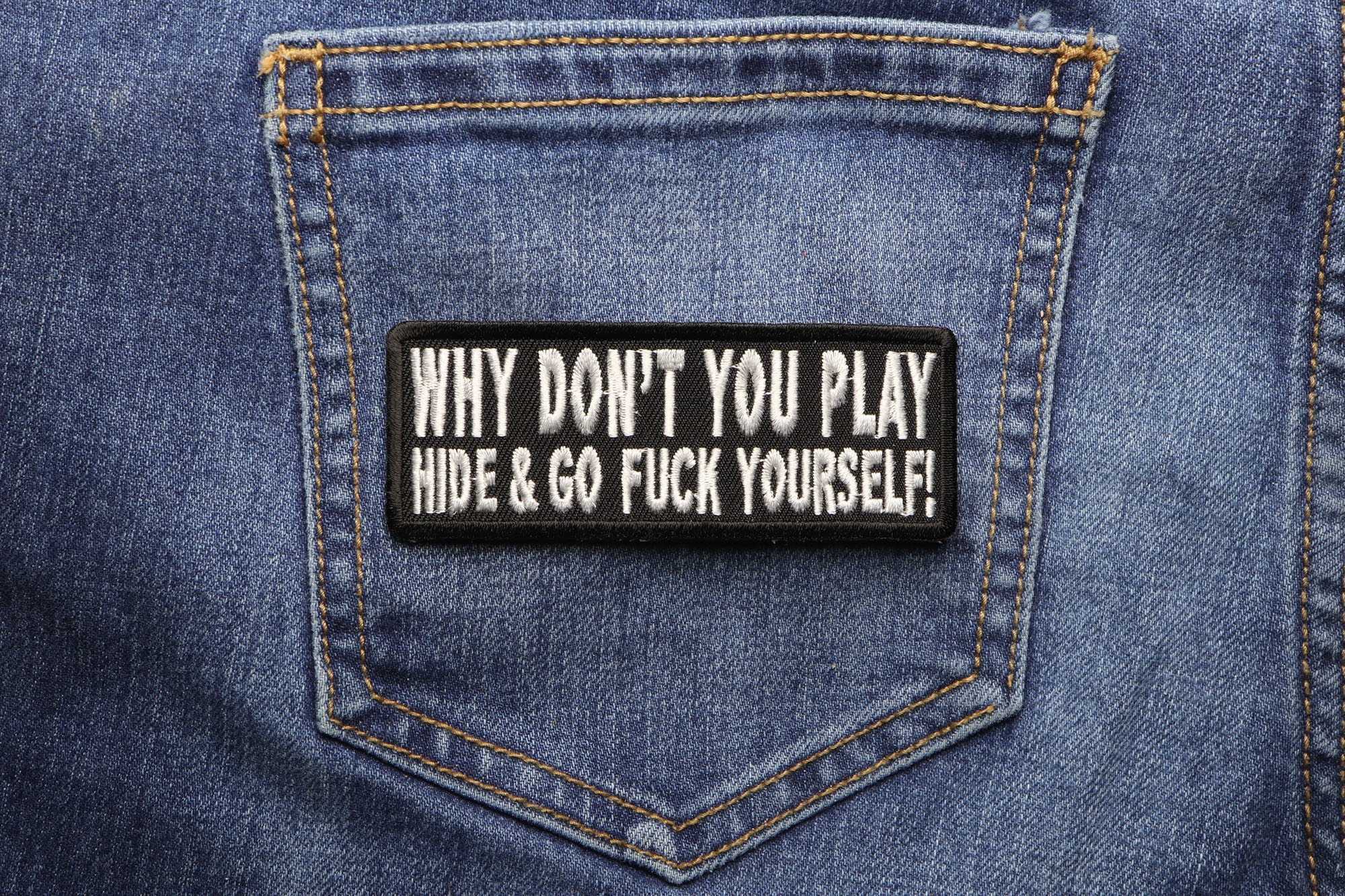 Why don't you hide and go fuck yourself? Why not? Tell them with this embroidered patch measuing 3.75x1.5 inches.