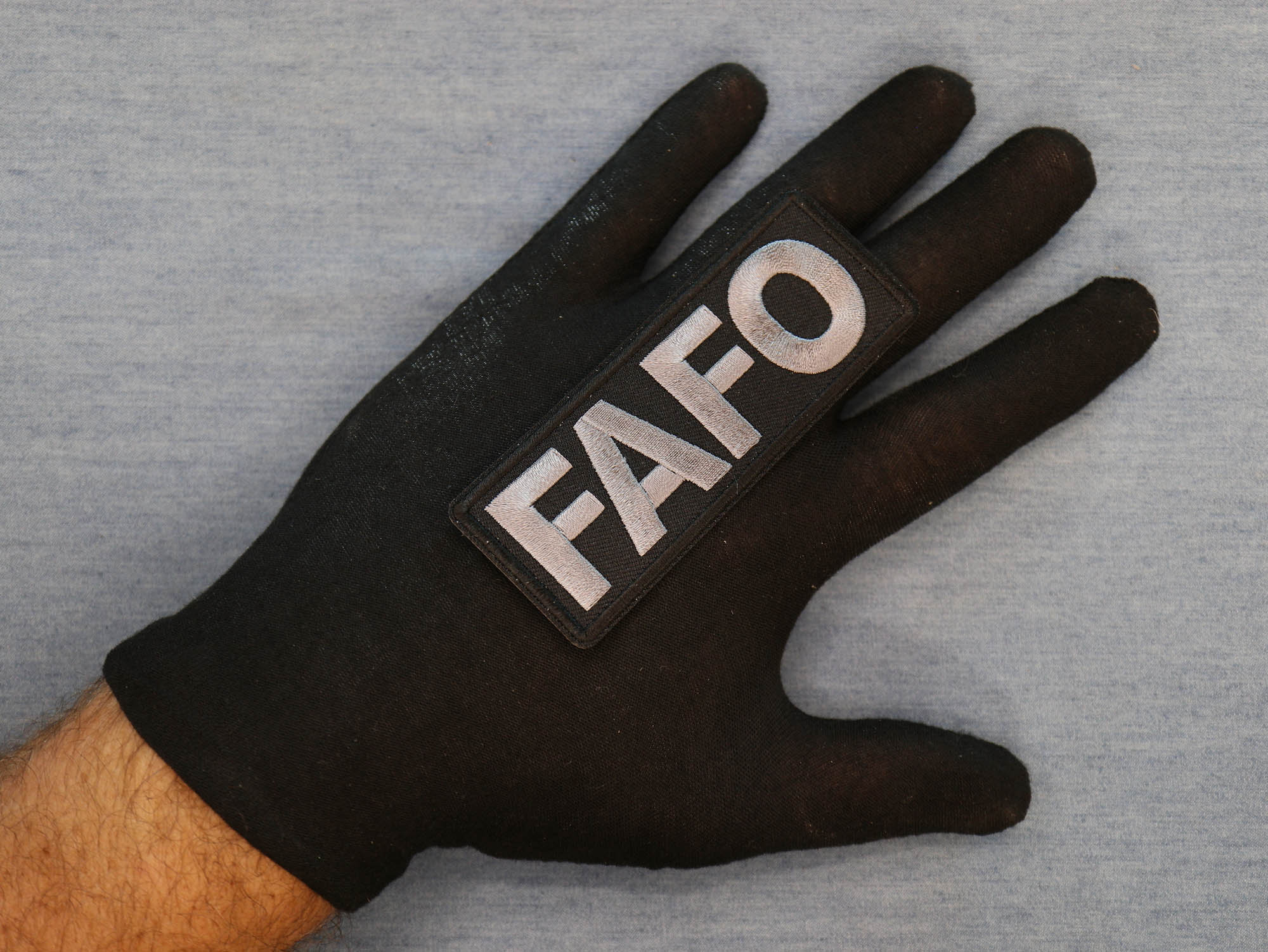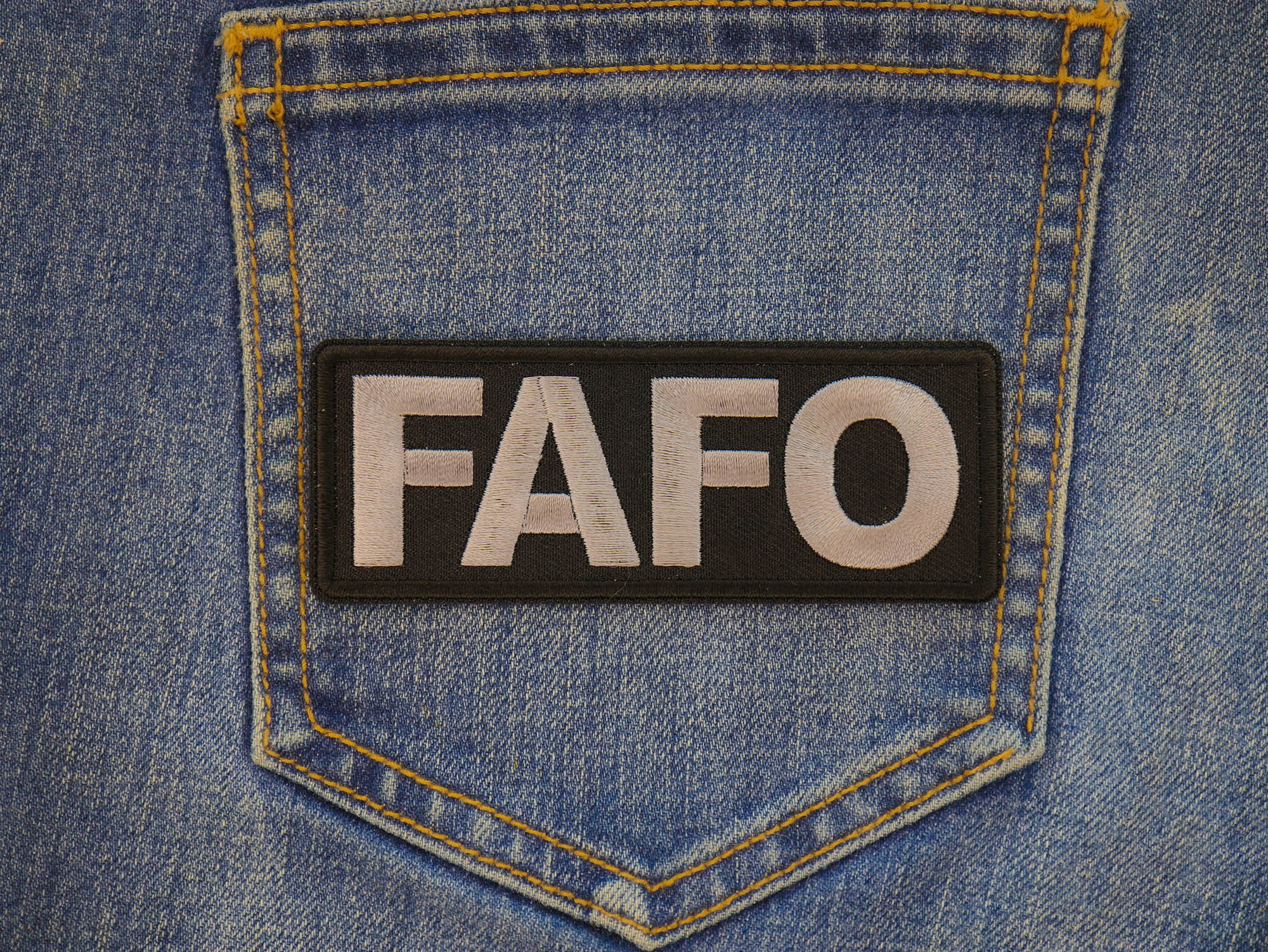 FAFO Patch measures 4x1.5 inches and is Embroidered in Black / Gray. The patch can be sewn on to Leather Biker Jackets, Vests or Chaps. The patch can also be ironed on to Shirts, Hats or Denim material such as Jeans. Features plastic iron on backing and clean laser cut embroidered borders. Japanese made iron on glue requires temperature between 270-290 Degrees Fahrenheit. Use a heat press for 30 seconds to adhere the patch permanently to your clothing. Using a regular household iron will probably not be as permanent as one hopes. If possible we recommend you sew on your patches for a more durable application. Never iron on patches to Leather or Nylon materials.