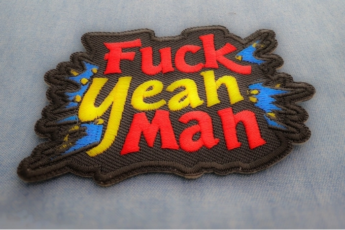 Fuck Yeah Man Patch measures 3x2.3 inches and is Embroidered in Black / Red / Yellow / Blue. The patch can be sewn on to Leather Biker Jackets, Vests or Chaps. The patch can also be ironed on to Shirts, Hats or Denim material such as Jeans. Features plastic iron on backing and clean laser cut embroidered borders. Japanese made iron on glue requires temperature between 270-290 Degrees Fahrenheit. Use a heat press for 30 seconds to adhere the patch permanently to your clothing. Using a regular household iron will probably not be as permanent as one hopes. If possible we recommend you sew on your patches for a more durable application. Never iron on patches to Leather or Nylon materials.